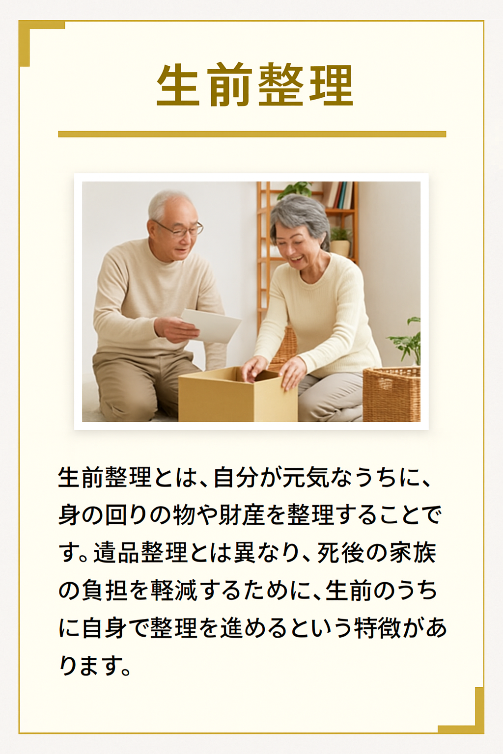 生前整理は生きているうちに身辺を整理することをさします。自身が亡くなるまでに自分のことは自分で、迷惑をかけたくない方などいらっしゃいます。